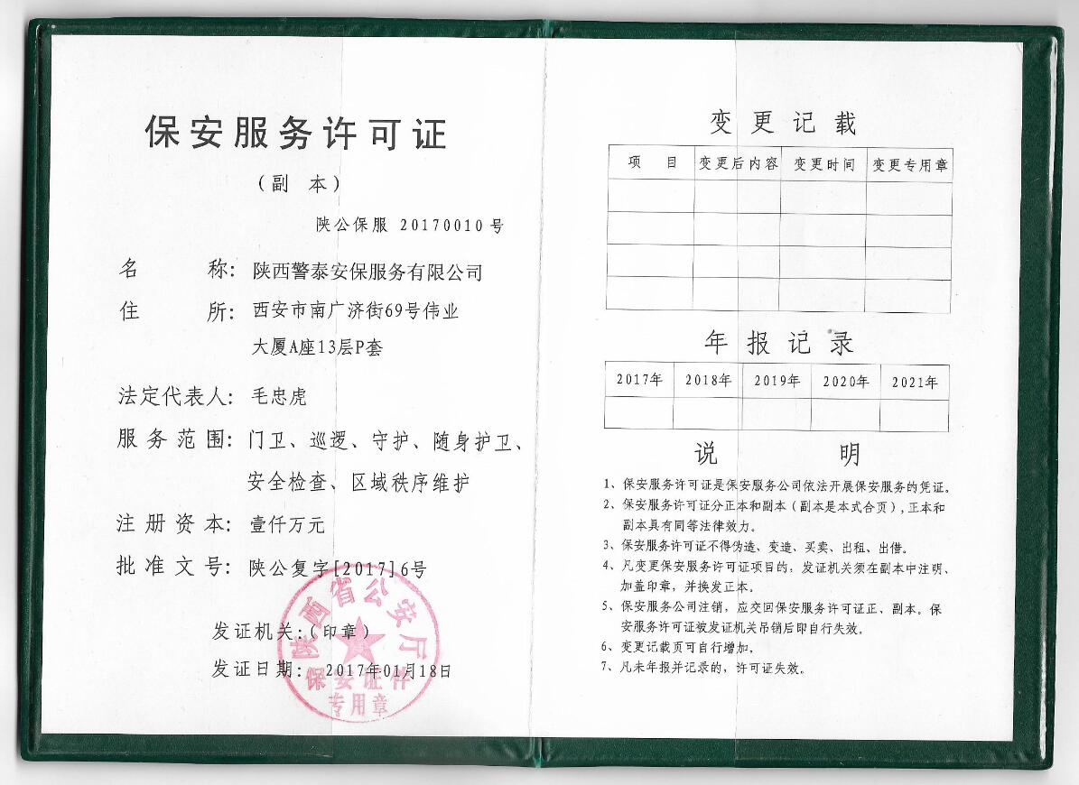 陜西警泰安保服務有限公司是經陜西省公安廳批準,西安市工商行政管理局登記注冊,具有獨立法人資格的專業保安服務公司。